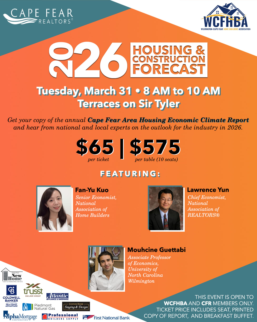 2026 Annual Housing & Construction Forecast The 2026 Annual Housing and Construction Forecast, presented in partnership with the Wilmington-Cape Fear Home Builders Association and the Cape Fear REALTORS®, will feature national experts Fan-Yu Kuo (NAHB) and Lawrence Yun (NAR) as well as local expert Mouhcine Guettabi (UNCW) to address what we can expect to see in the industry in 2026. This year's forecast will be at the Terraces on Sir Tyler. Registration includes breakfast and a physical copy of this year's Cape Fear Area Housing Economic Climate Report.